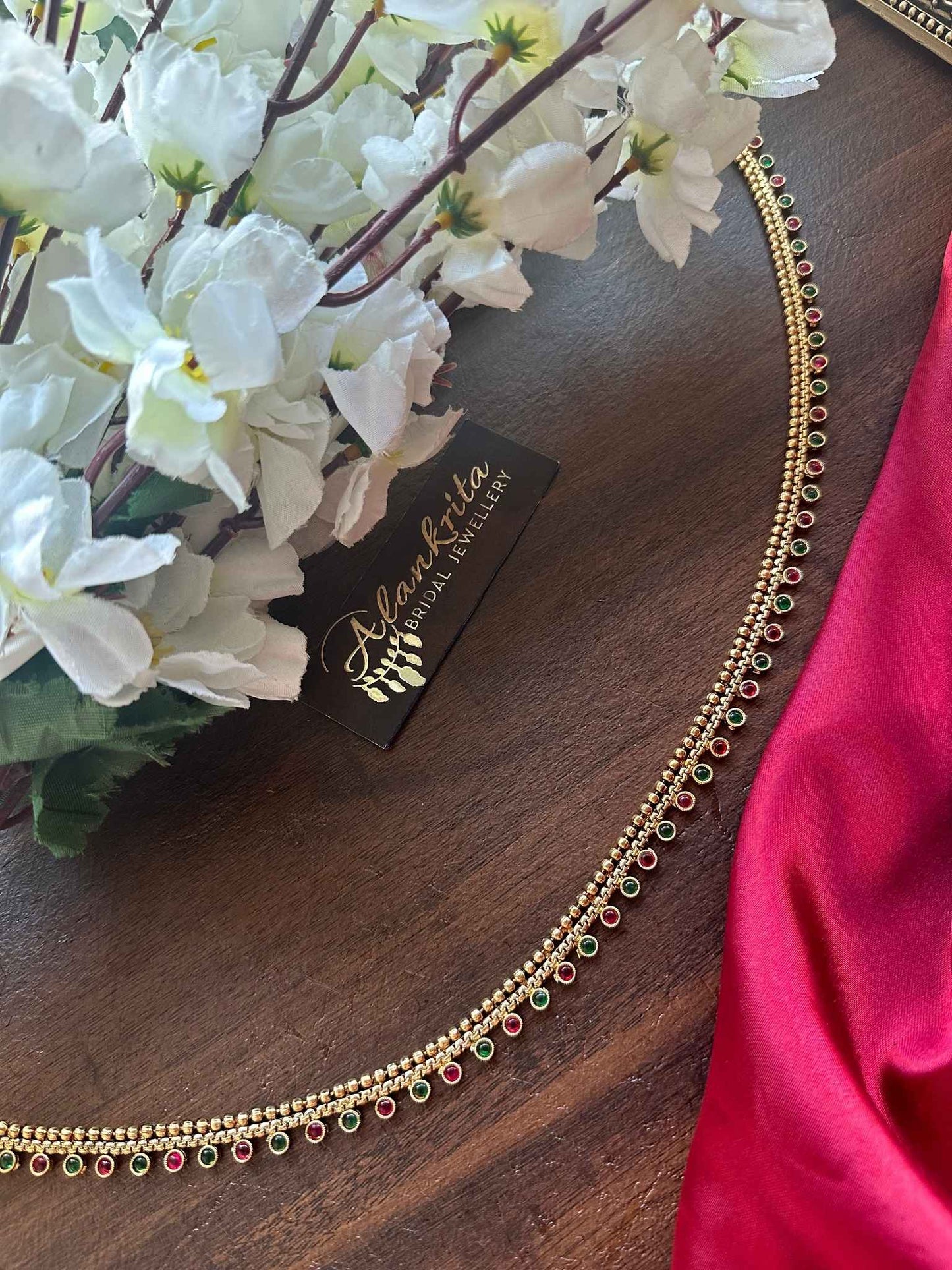 Simple Gold Look Alike Thin Hip Chain with Green & Ruby Stones