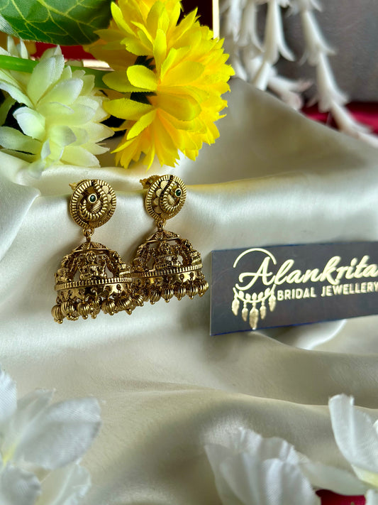 Premium Antique Gold Jhumka with AD stones & Pastal Green Beads